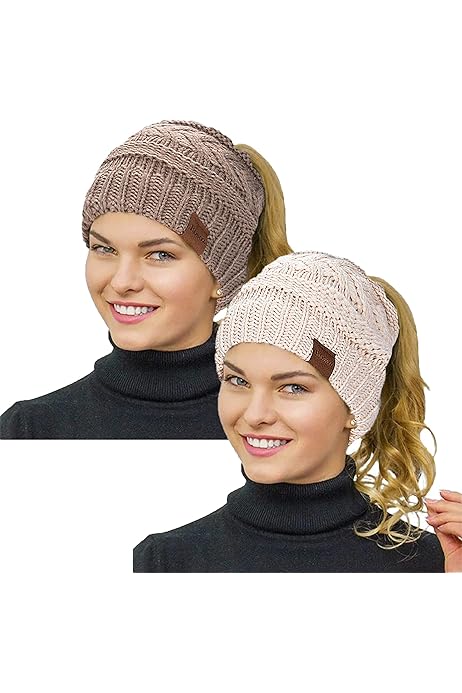 C C Beanietail Soft Stretch Cable Knit Messy High Bun Ponytail Beanie Hat 2 Tone Black Dark Beige At Amazon Women S Clothing Store